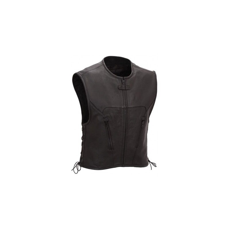 Men Black Premium Naked Leather Urban Style Motorcycle Vest with Single Panel Back. Soft Milled 1.1-1.2mm Naked Cow Hide. Unique styling details and cut lines. Black Plastic # 10 hidden front zipper, with single hidden snap closure at the collar. Leather piping trimmed generous armholes. 2 outside zippered pockets. 2 inside pockets, one zippered one snap closure. Single panel back, ideal for patches, embroidery or airbrushed art work. American sizing, ample length, very Generous oversize fit. Side Lacing for additional size adjustment. Gives this unique style a motorcycle look. Heavy duty long lasting black polyester Taffeta lining.