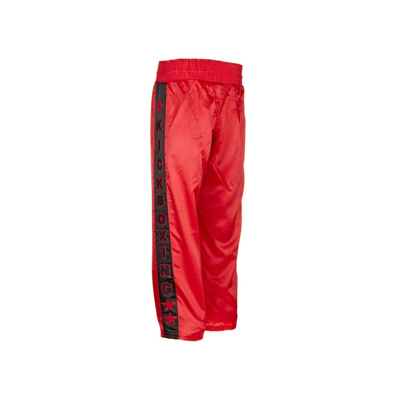 Full contact trousers made of 100% lightweight satin. With elasticated waistband. Trousers are all red in colour with black stripes with black "kickboxing"writing on both sides.